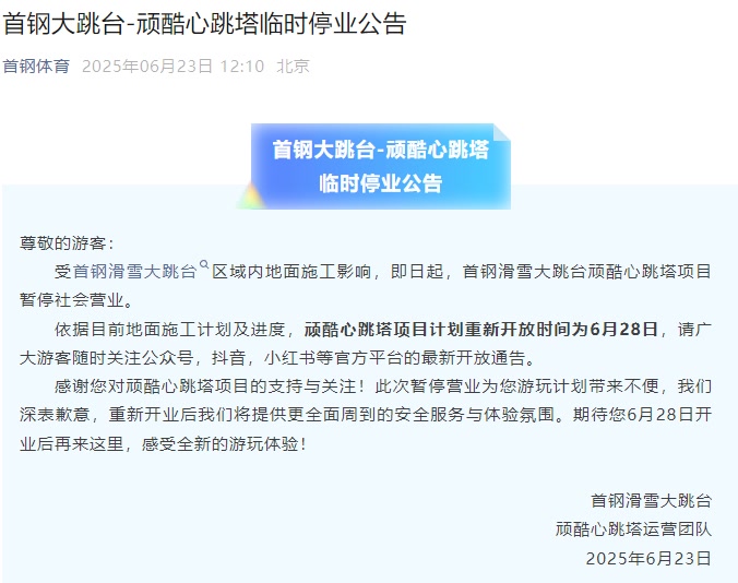 据“首钢体育”微信公众号消息,受首钢滑雪大跳台区域内地面施工影响,即日起,首钢滑雪大跳台顽酷心跳塔项目暂停社会营业。
